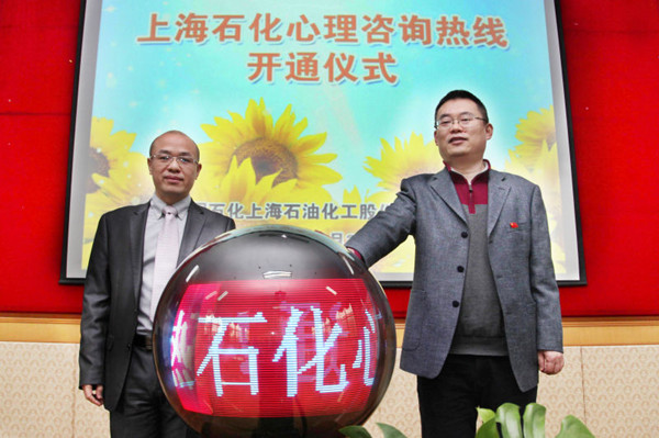 上海石化黨委書(shū)記高金平與EAP項(xiàng)目合作商負(fù)責(zé)人鄭華輝共同按下啟動(dòng)球,正式開(kāi)通上海石化心理咨詢(xún)熱線(xiàn)。