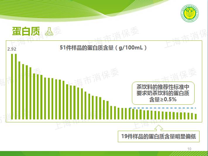 蛋白質(zhì)在奶茶中的主要來(lái)源是奶,本次比較試驗(yàn)的測(cè)試結(jié)果顯示,51件樣品中,蛋白質(zhì)含量最高的達(dá)到2.92g/100ml,接近普通牛奶的蛋白質(zhì)含量;雖然目前對(duì)現(xiàn)制茶飲料(奶茶)的蛋白質(zhì)含量并無(wú)國(guó)家強(qiáng)制性標(biāo)準(zhǔn)要求,但若參考茶飲料的推薦性標(biāo)準(zhǔn)中要求奶茶飲料的蛋白質(zhì)含量≥0.5%,則有19件樣品的蛋白質(zhì)含量明顯偏低。