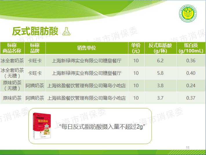 乳制品中存在著天然的反式脂肪酸,但由于含量不高并不影響健康,而在油脂氫化過(guò)程中產(chǎn)生的反式脂肪酸若攝入過(guò)量則影響兒童發(fā)育,引發(fā)心血管疾病和肥胖等!吨袊(guó)居民膳食指南(2016)》建議“每日反式脂肪酸攝入量不超過(guò)2g”。本次比較試驗(yàn)發(fā)現(xiàn),有4件樣品含有較高的反式脂肪酸,一杯奶茶的反式脂肪酸含量在3.7-6.2g之間,而且這4件樣品的蛋白質(zhì)含量不高,說(shuō)明奶原料的質(zhì)量不好。