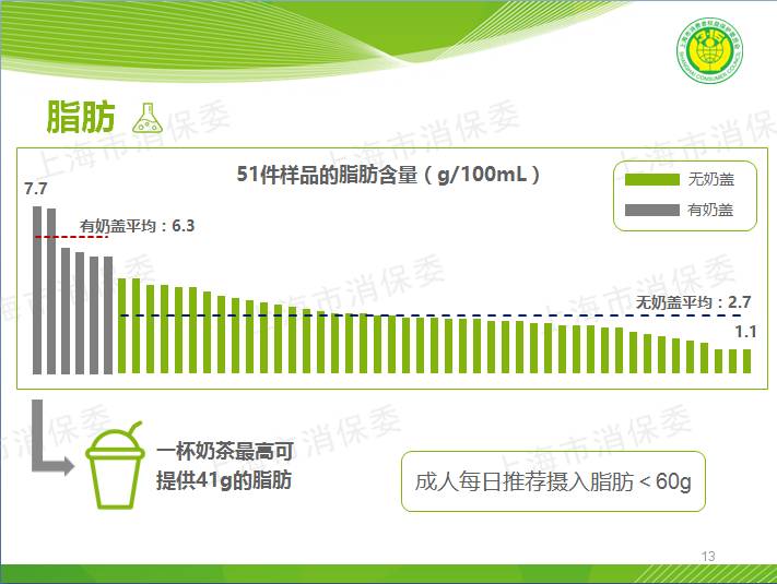 本次比較試驗(yàn)測(cè)試結(jié)果顯示,45件無(wú)奶蓋的奶茶脂肪含量在1.1-4.4g/100mL之間,平均為2.7g/100mL;6件有奶蓋的奶茶脂肪含量在5.4-7.7g/100mL之間,平均為6.3g/100mL。脂肪含量最多的一杯奶茶可提供41g的脂肪,超過(guò)成人每日推薦攝入脂肪量的2/3,而成人每日推薦攝入的脂肪小于60g。