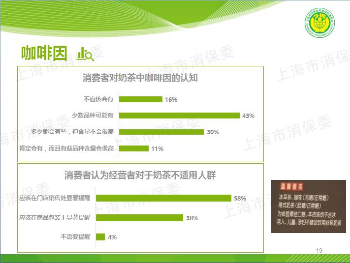 但在本次比較試驗(yàn)購(gòu)樣過(guò)程中發(fā)現(xiàn),27家店鋪中僅有1家店鋪給出了“老人、兒童、孕婦不建議飲用絲襪奶茶”的“溫馨提示”,而多數(shù)消費(fèi)者并不知道奶茶中也會(huì)含有咖啡因。調(diào)查結(jié)果顯示,僅有11%的被訪者認(rèn)為“奶茶中肯定會(huì)有咖啡因,而且有些品種含量會(huì)很高”,甚至有16%的被訪者認(rèn)為“奶茶中不應(yīng)該會(huì)有咖啡因”。而96%的被訪者認(rèn)為,對(duì)于奶茶不適合部分人群飲用的情況,經(jīng)營(yíng)者應(yīng)在門(mén)店或商品包裝包裝的顯著位置作出提醒。