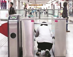和最早的“三桿式”閘機不同,為了更方便乘客通過閘機,同時減少設施占地面積,近年來滬上地鐵車站新設了“門式閘機”,以左右兩扇小門取代“三桿式”。這種“門式閘機”的底部縫隙也比“三桿式”明顯縮小,客觀上增大了逃票者“鉆”過閘機的難度。目前在地鐵虹橋火車站站,“門式閘機”也已安裝到位。不過,對于逃票人來說,為了逃過幾塊錢,不惜用“吃相難看”的“奇葩”動作來化解“難題”。