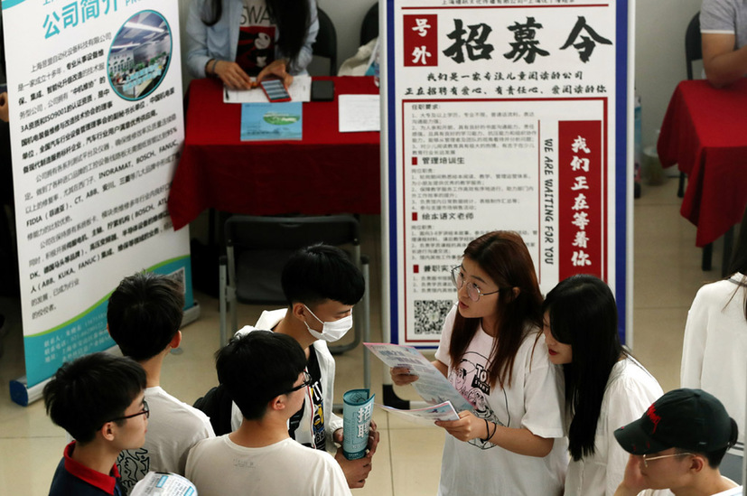 5月19日,鹽城市人才服務(wù)中心的工作人員向畢業(yè)生介紹鹽城的人才引進(jìn)政策和福利。