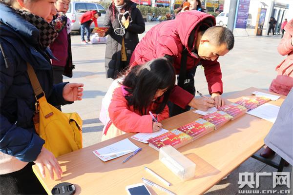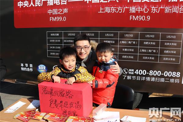 今天(23日)上午,中央人民廣播電臺中國之聲、中國交通廣播和東廣新聞臺聯(lián)合直播的“2017年春運特別節(jié)目”《溫暖回家路》,在上海火車站的南廣場進(jìn)行了現(xiàn)場直播。在直播現(xiàn)場,旅客也可以到直播車前,免費領(lǐng)取一張《春運特別直播明信片》,旅客可以把給親人或者朋友的祝福留下,將會有專人替旅客免費郵寄。圖為今天活動現(xiàn)場第一位參與者(央廣網(wǎng)記者唐奇云 攝)