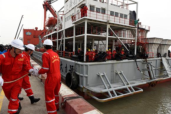 4月5日下午13時左右,上海外高橋碼頭人頭攢動,“世越號”打撈指揮船“大力號”穩(wěn)穩(wěn)地靠泊上海外高橋碼頭,船舷兩側(cè)的“上海打撈”標(biāo)志格外醒目。