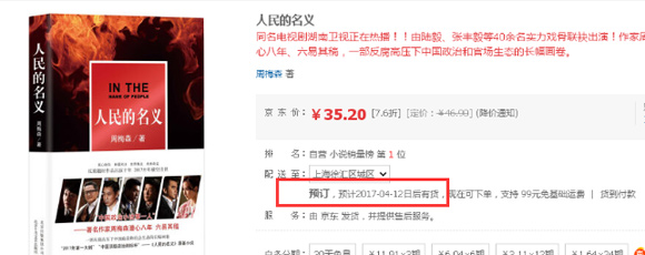 不僅僅在實體書店,網(wǎng)上購書平臺同樣也不能及時買到紙質書《人民的名義》。在圖書電商當當、京東上,搜索“人民的名義”,頁面都顯示預售,“預計2017-04-12日后有貨”。雖然在亞馬遜上,《人民的名義》位列紙質書銷售排行榜第二,頁面顯示有貨,最快也是“4月12日送達”。