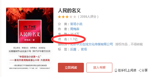 網(wǎng)易云閱讀頁面截圖,《人民的名義》閱讀量1.7億