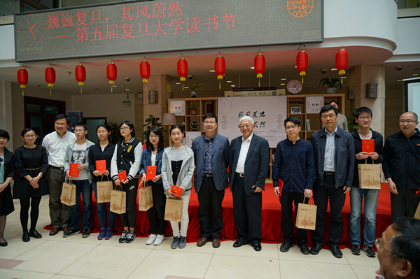 劉承功、陳思和等嘉賓,圖書館、宣傳部、團(tuán)委有關(guān)負(fù)責(zé)人,以及本次活動的贊助方中國銀行復(fù)旦支行行長周怡芳為復(fù)旦大學(xué)2016年度“閱讀達(dá)人”、優(yōu)秀志愿者代表頒獎。