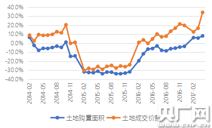 開發(fā)企業(yè)土地購置面積和成交價款同比增速
