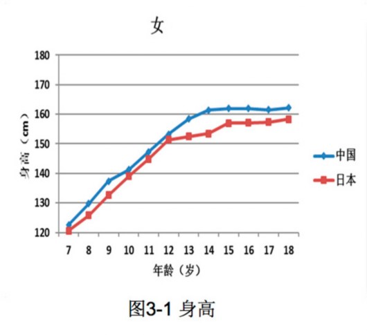 譬如,7-18歲中日兒童青少年(男)身高統(tǒng)計中,除12歲外,中國男生均顯著高于日本男生。中國女生各年齡段也均顯著高于日本女生。