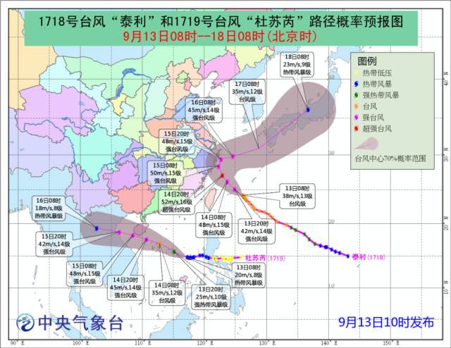 今年第18號臺風(fēng)“泰利”(臺風(fēng)級),今天10時中心距離浙江省象山縣東南方向約700公里,中心氣壓965hPa,中心附近最大風(fēng)力13級(38米/秒)。