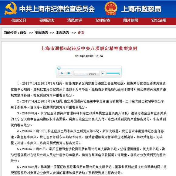 東方網(wǎng)9月22日消息:據(jù)中共上海市紀(jì)律檢查委員會網(wǎng)站消息,上海市通報6起違反中央八項規(guī)定精神典型案例: