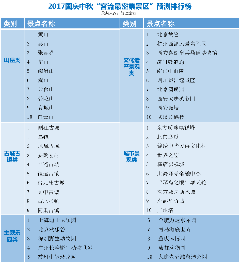 攜程今發(fā)布國慶“最擠人”5大類50個景區(qū)名單