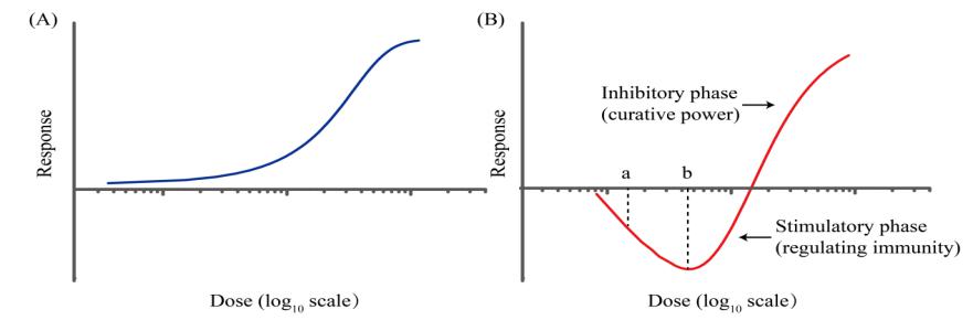 西方傳統(tǒng)毒理藥理的觀點認為,隨著化合物濃度的增加,化合物對生物體的毒性抑制作用越大,化合物的劑量-效應曲線呈現(xiàn)經(jīng)典的 S型曲線(圖 1A)!耙驗槲魉幋蠖际歉邉┝繂我坏幕衔,因此,西醫(yī)用藥就是依據(jù)這一S型曲線,科學地確定藥物劑量!绷种痉医淌谡f。