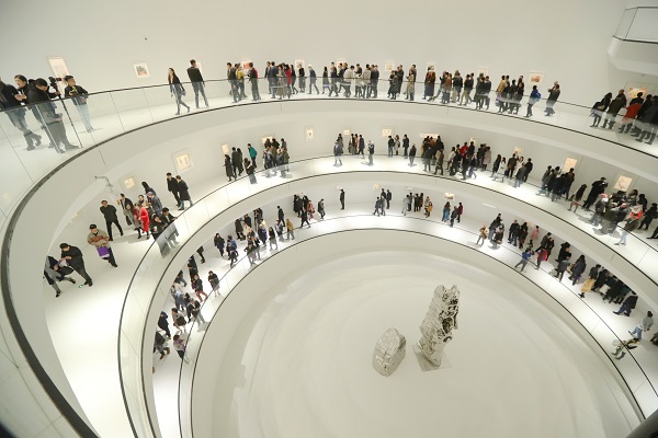 開館僅3個多月、位于閔行七寶的寶龍美術(shù)館有一個類似紐約古根海姆美術(shù)館的圓形展廳,春節(jié)入館人數(shù)創(chuàng)下新紀錄,單日入館人數(shù)近4000人,會員卡銷售1500余張,這在新晉民營美術(shù)館中算得上網(wǎng)紅級。
