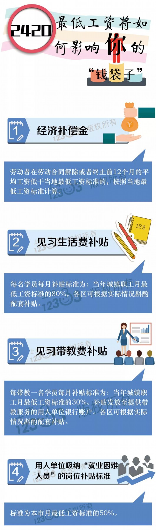 本市將從2018年4月1日起調(diào)整最低工資標(biāo)準(zhǔn):月最低工資標(biāo)準(zhǔn)從2300元調(diào)整到2420元,增加120元;小時最低工資標(biāo)準(zhǔn)從20元調(diào)整到21元。那么,最低工資與哪些待遇有關(guān)?將如何影響你的“錢袋子”? 以下是市人社局整理的與最低工資有關(guān)的15項(xiàng)待遇,包括經(jīng)濟(jì)補(bǔ)償金、見習(xí)生活費(fèi)補(bǔ)貼、帶病工資或疾病救濟(jì)費(fèi)等,一起來看看。