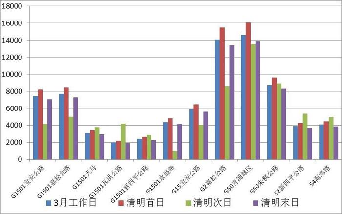 高速公路方面,通往市郊墓區(qū)和江蘇、浙江方向的射線高速公路將承擔(dān)較大的掃墓車流。其中車流量較大的道口有:G2江橋、嘉松、安亭;G15朱橋、寶安公路;G50徐涇、嘉松、青浦城區(qū)、朱楓公路;G60新橋、楓涇;S4南橋、海灣;S2康橋、新四平;G1501嘉松北、永盛路、新四平、瓦洪公路等高速公路出入口以及S5南翔、馬陸等匝道。此外,G40滬陜高速公路作為崇明、啟東方向的快速通道,清明期間交通壓力也較大。地面道路方面,嘉松公路、寶安公路、滬宜公路、豐翔路、外青松公路、新四平公路、川南奉公路等臨近墓區(qū)路段也將出現(xiàn)不同程度的流量激增。