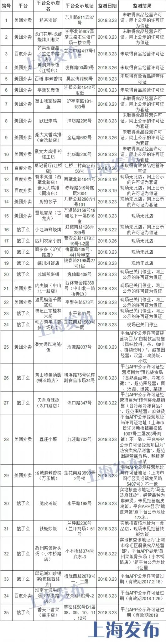 市食藥監(jiān)局今天發(fā)布最新一輪網(wǎng)絡餐飲服務監(jiān)測情況:美團外賣平臺的豪大大香雞排(金運路店)、餓了么平臺的動力雞車(麥多廣場店)、百度外賣平臺的有米粥道(西藏北路店)等35家店鋪存在未取得食品經(jīng)營許可證、網(wǎng)上公示的許可證為假證等問題。市食藥監(jiān)局已責令相關店鋪立即整改,并依法查處。