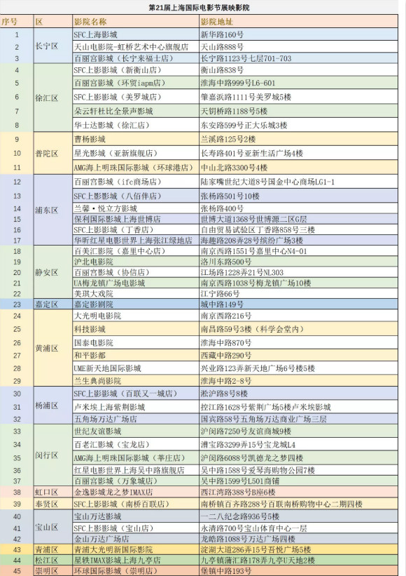 今天,第21屆上海國際電影節(jié)公布45家展映影院名單。今年3月起,上海國際影視節(jié)中心和上海市電影發(fā)行放映行業(yè)協(xié)會啟動本屆電影節(jié)展映影院征選,全市共有86家影院報名。為了給影迷們帶來一流觀影體驗,上海國際電影節(jié)展映影院的評選,以區(qū)域布點、影院座位數(shù)絕對值、星級影院、影院安全服務保障等多項條件為基礎,針對服務質量、放映安全、技術設備亮點等進行了多重考核。經(jīng)過實地考察和層層篩選,最終,45家影院脫穎而出。其中,除了老牌的上海影城、大光明、新衡山、和平影都等之外,還有11家新晉影院入選。
