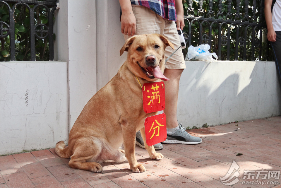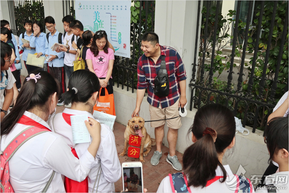 在考點(diǎn)外牽著掛滿分牌小狗的送考老師特別惹人注目,這名老師是新中初級(jí)中學(xué)的徐老師,因?yàn)榭紙?chǎng)恰巧在家附近,他就把家中的拉布拉多犬“小布”帶來給學(xué)生們加油打氣,緩解一下學(xué)生們緊張的心情!靶〔肌辈弊由系臐M分牌也是徐老師的學(xué)生制作的。