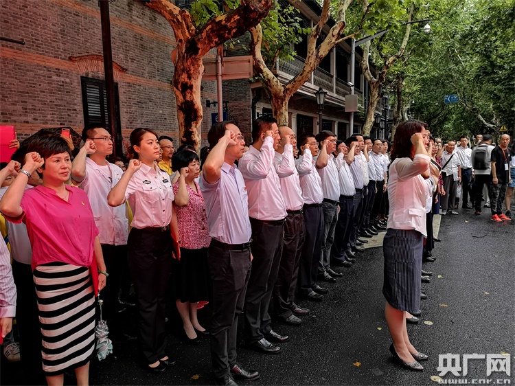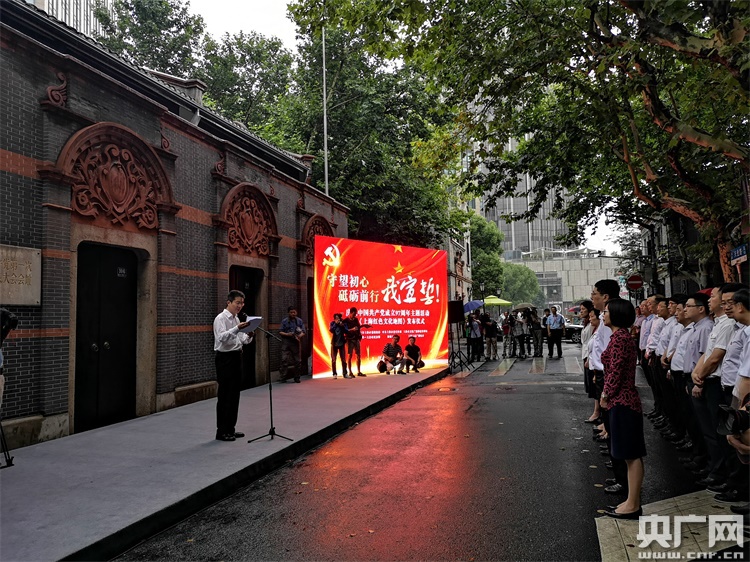 央廣網(wǎng)上海7月1日消息(記者傅聞捷)今天上午,為慶祝中國共產(chǎn)黨成立97周年,“守望初心,砥礪前行——我宣誓!”“七一”主題活動在中共一大會址舉行。在剛剛接受聘書的中共一大會址紀念館首批領(lǐng)誓人的帶領(lǐng)下,數(shù)十名來自基層一線的黨員代表面對黨旗莊嚴宣誓,聆聽“初心與使命”情景黨課并參觀陳列展。當(dāng)天,中共一大會址“全國重點文物保護單位”標志牌揭牌,并向“黨的誕生地”黨員志愿服務(wù)隊授旗,《上海紅色文化地圖》也在活動上首發(fā)。