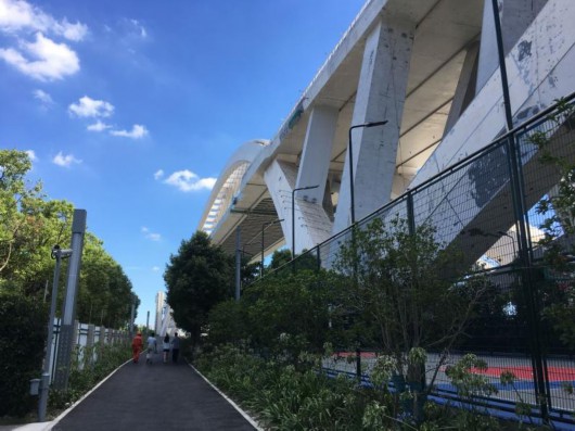 記者在現(xiàn)場看到盧浦大橋橋下的景觀平臺暫時封閉,但慢行道依然暢通