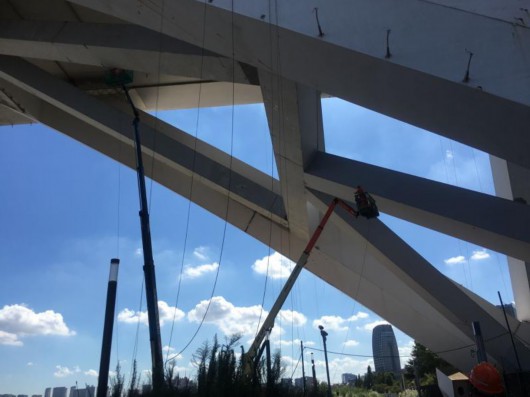 橋上,陽光把路面“炙烤”到60℃;橋下,三四個全副武裝的“蜘蛛俠”吹著浦江風,仔細打磨橋面原有涂裝。腳下的作業(yè)臺,由一根數(shù)十米長的機械手臂支撐,另一頭連接著一臺作業(yè)車,機械手臂正緩慢移動。