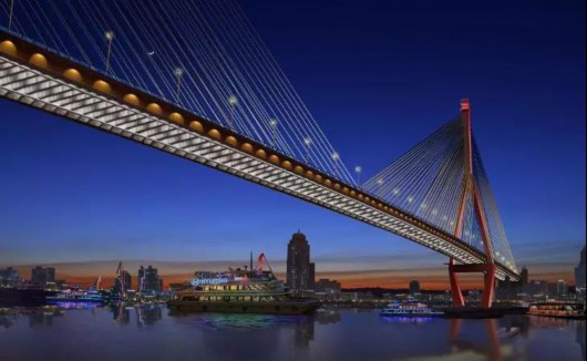 橋兩側(cè)的燈光,可以按照節(jié)奏變化。橋腹部采用燈光打亮,照亮江面,形成倒影。節(jié)假日期間,楊浦大橋的橋側(cè)和橋腹采用單色燈,襯托出大橋的暗紅色,凸顯工業(yè)印象。