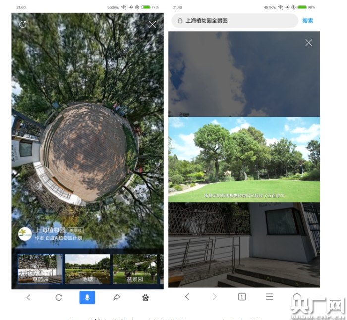 “全景科普”中融合了上海植物園內(nèi)多個(gè)園區(qū)的全景圖,讓游客即使不能親臨現(xiàn)場(chǎng),也可以用手機(jī)在線游覽上海植物園;而即將上線的“智能導(dǎo)覽”功能,則可以借助百度地圖提供的技術(shù)能力,為游客提供推薦游玩路線、AR導(dǎo)游以及智能語(yǔ)音導(dǎo)覽等功能。