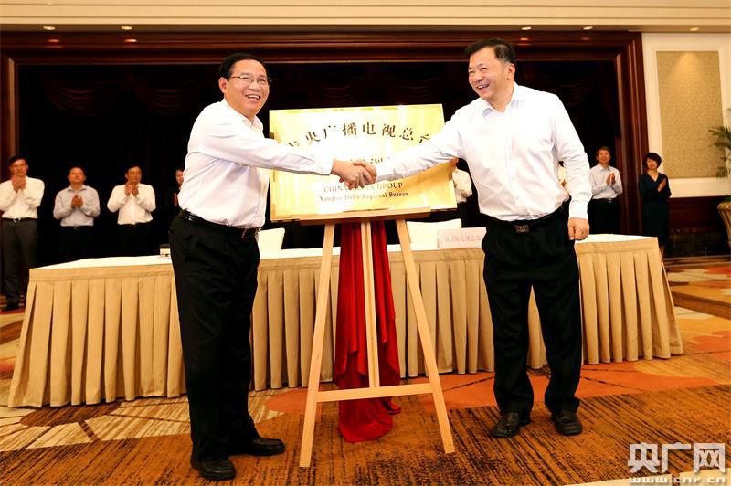 中央政治局委員、上海市委書(shū)記李強(qiáng)與中央廣播電視總臺(tái)臺(tái)長(zhǎng)慎海雄共同為中央廣播電視總臺(tái)長(zhǎng)三角總部揭牌。(新華社記者 凡軍攝)