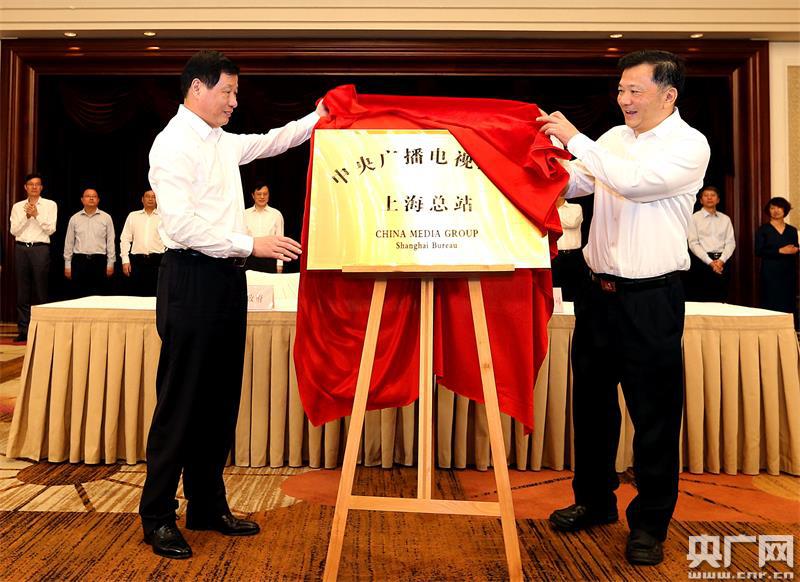 上海市委副書(shū)記、上海市市長(zhǎng)應(yīng)勇與中央廣播電視總臺(tái)臺(tái)長(zhǎng)慎海雄共同為中央廣播電視總臺(tái)上?傉窘遗。(新華社記者 凡軍攝)