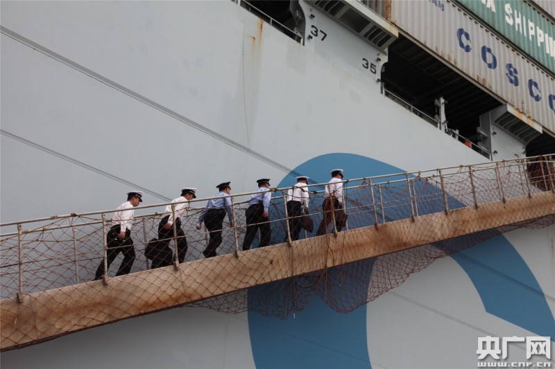 口岸單位執(zhí)法人員登臨中遠(yuǎn)西班牙輪(央廣網(wǎng)發(fā) 韓帥攝)
