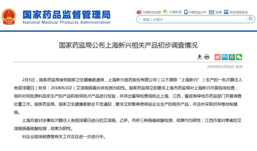 2月5日,國家藥監(jiān)局接到國家衛(wèi)生健康委通報(bào),上海新興醫(yī)藥股份有限公司(以下簡稱“上海新興”)生產(chǎn)的一批次靜注人免疫球蛋白(批號:20180610Z)艾滋病病毒抗體檢測為陽性。國家藥監(jiān)局立即要求上海市藥監(jiān)局對上海新興開展現(xiàn)場檢查,組織對同批原料血漿生產(chǎn)的產(chǎn)品和相鄰批次產(chǎn)品進(jìn)行檢驗(yàn),并派出督導(dǎo)檢查組抵達(dá)上海、江西,督促指導(dǎo)地方藥監(jiān)部門開展調(diào)查處置工作。國家藥監(jiān)局、國家衛(wèi)生健康委聯(lián)合下發(fā)通知,要求立即暫停使用該企業(yè)生產(chǎn)的相關(guān)產(chǎn)品,并及時采取封存等控制措施。