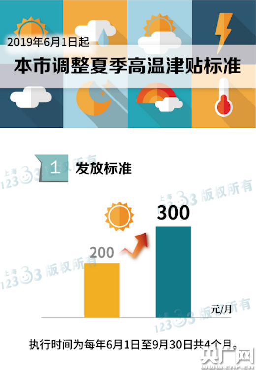 央廣網(wǎng)上海5月21日消息(記者楊靜)經(jīng)上海市委、市政府同意,日前,上海市人力資源社會保障局印發(fā)《關(guān)于調(diào)整本市夏季高溫津貼標(biāo)準(zhǔn)的通知》,將上海夏季高溫津貼標(biāo)準(zhǔn)從200元/月調(diào)整為300元/月,執(zhí)行時(shí)間為每年6月1日至9月30日,共四個月。