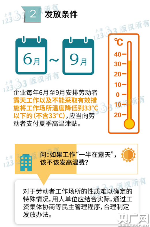 通知要求,企業(yè)每年6月至9月安排勞動者露天工作以及不能采取有效措施將工作場所溫度降低到33℃以下的(不含33℃),應(yīng)當(dāng)向勞動者支付夏季高溫津貼。對于勞動者工作場所的性質(zhì)難以確定的特殊情況,企業(yè)應(yīng)結(jié)合實(shí)際,通過工資集體協(xié)商等形式,合理制定發(fā)放辦法。