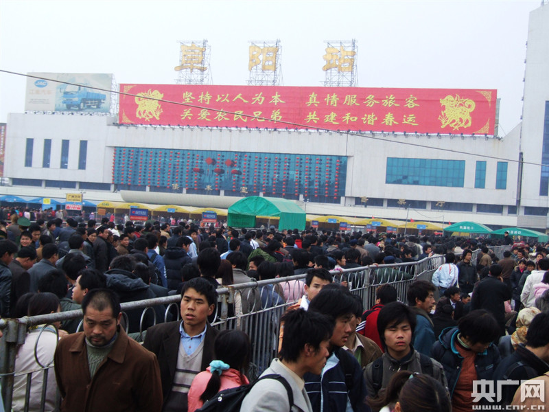 2006年春運(yùn),阜陽站前民工潮涌。(央廣網(wǎng)發(fā) 中國鐵路上海局集團(tuán)有限公司提供)