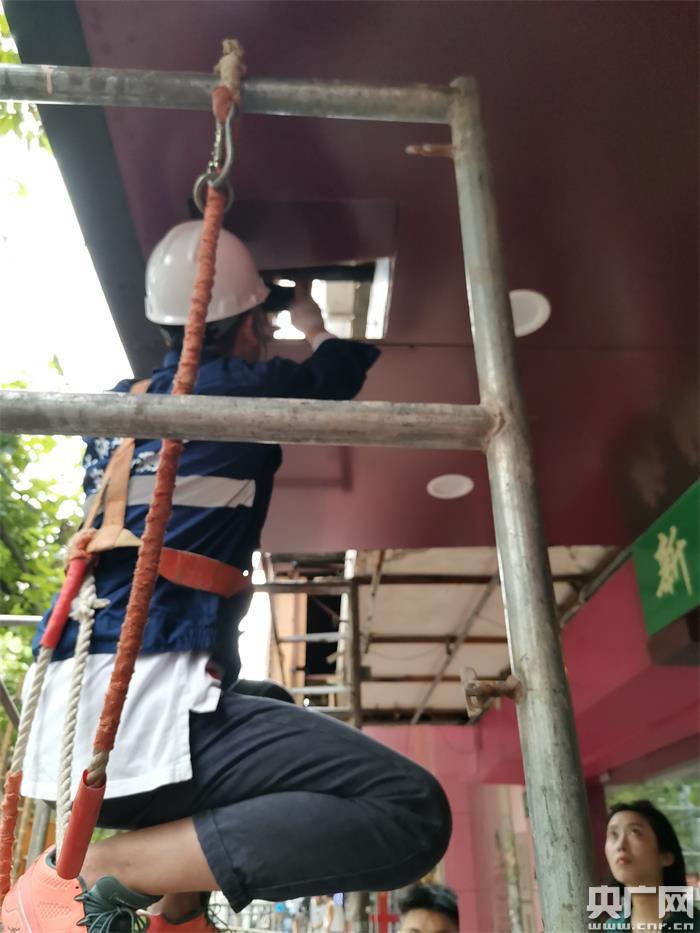 對(duì)店招進(jìn)行緊急檢查(央廣網(wǎng)記者 周洪 攝)