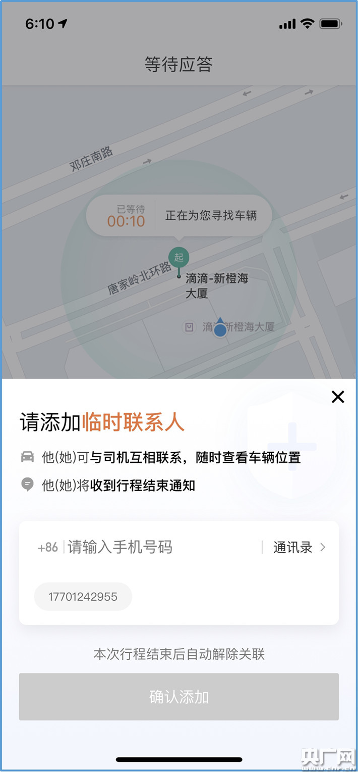 平臺將引導乘客添加臨時聯(lián)系人(央廣網(wǎng)發(fā) 滴滴提供)
