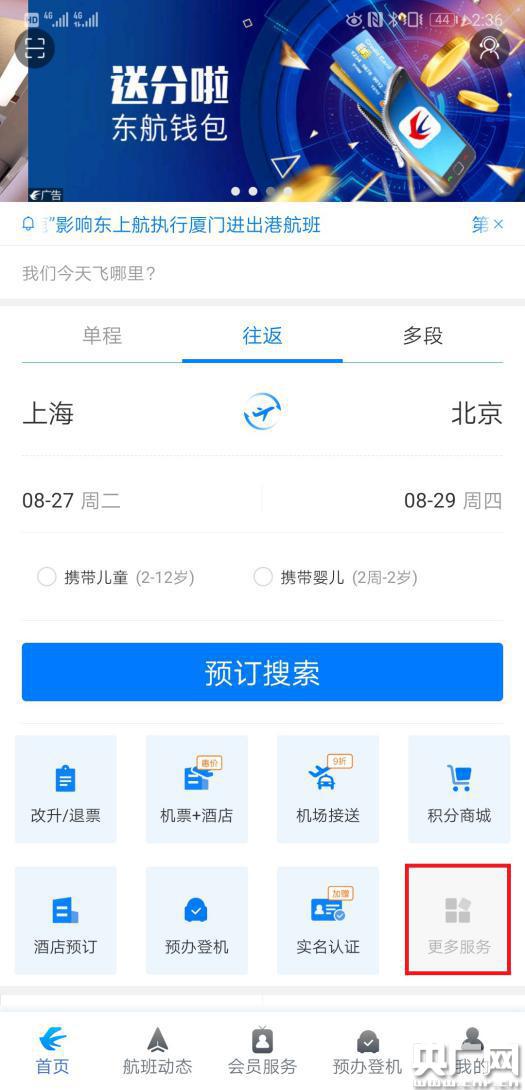 1.打開東方航空最新版APP,在【首頁】選擇【更多服務】