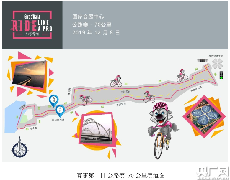 賽事第二日為傳奇賽與公路賽,傳奇賽與公路賽出發(fā)時間分別為12月8日的早7時 與7時20分,公路賽為開放性賽事,所有自行車選手及愛好者均可報名,傳奇賽與 公路賽使用同一條封閉賽道,全程長 70 公里,以國際會展中心作為起終點,西 行盡覽青浦風(fēng)光,同時還會經(jīng)過淀山湖、彩虹橋等著名地標。
