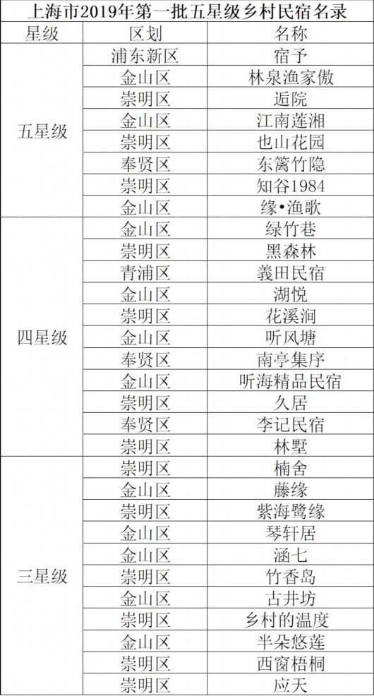 今天起,上海民宿也開始評(píng)星級(jí)了。據(jù)悉,此次鄉(xiāng)村民宿等級(jí)評(píng)定工作于8月份啟動(dòng),經(jīng)自愿申報(bào)、各區(qū)初審、專家評(píng)定等環(huán)節(jié),共評(píng)選出了五星級(jí)鄉(xiāng)村民宿8家,四星級(jí)鄉(xiāng)村民宿11家,三星級(jí)鄉(xiāng)村民宿11家。