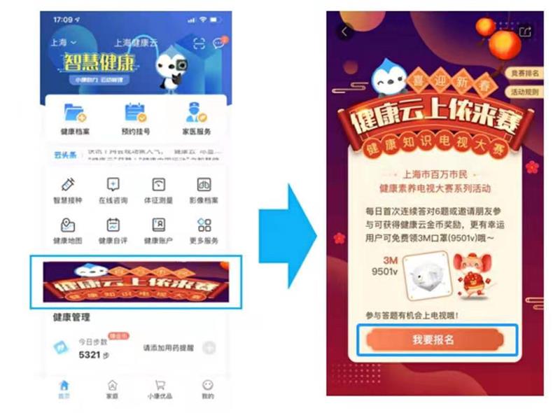 央廣網(wǎng)上海1月25日消息(記者楊靜)從年三十晚20:00到年初六晚24:00,由上海市衛(wèi)生健康委員會、上海市健康促進委員會辦公室指導(dǎo),上海市健康促進中心、萬達信息股份有限公司聯(lián)合主辦的“迎新春健康知識有獎競答——健康云上儂來賽”活動火熱開賽啦!