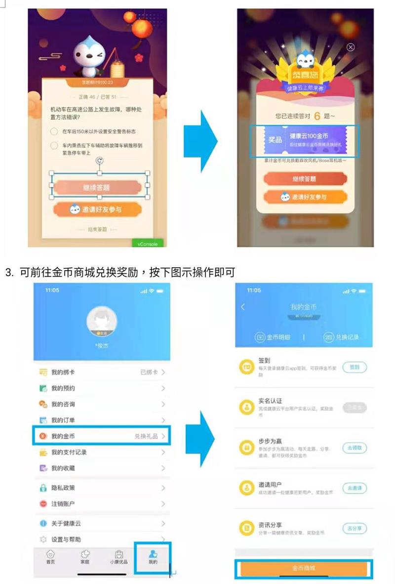 市民可通過“上海健康云”APP或微信答題頁面,進入大賽專用功能模塊和頁面參與線上競答。每日首次連續(xù)答對6道題或邀請好友參與都可領(lǐng)取“健康云”金幣獎勵,累計一定數(shù)額可兌換禮品。更有幸運用戶可免費領(lǐng)3M口罩,讓預(yù)防病毒不再成為難題!此外,線上競答中脫穎而出的選手還將有機會獲得電視大賽的候選人資格,參與熒屏角逐。