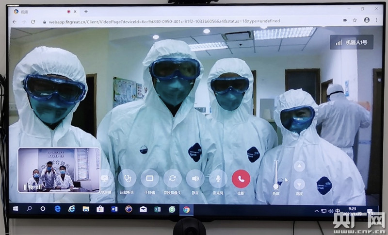 隔離診區(qū)的醫(yī)務(wù)人員通過“小白”連線醫(yī)院防控組專家(央廣網(wǎng)發(fā) 上海兒童醫(yī)學(xué)中心供圖 )
