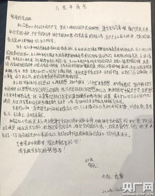 為避免交叉感染,病房里不能開空調(diào),還得整日開窗通風(fēng),武漢的冬天格外寒冷,一夜下來雙手就都凍麻了。但就是在這樣艱苦的一線環(huán)境中,日以繼夜工作的惠蔚,從最前線發(fā)來了一封入黨申請書。她親筆動情地書寫下了這樣的話: