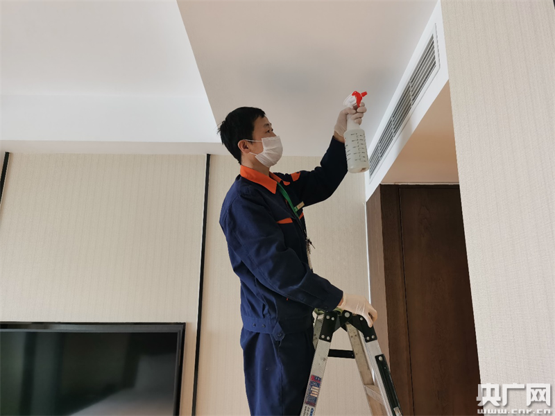 酒店工程部對客房空調(diào)出風(fēng)口進(jìn)行消毒殺菌