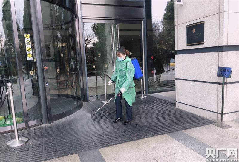 酒店客房部員工在大堂門口做消毒殺菌