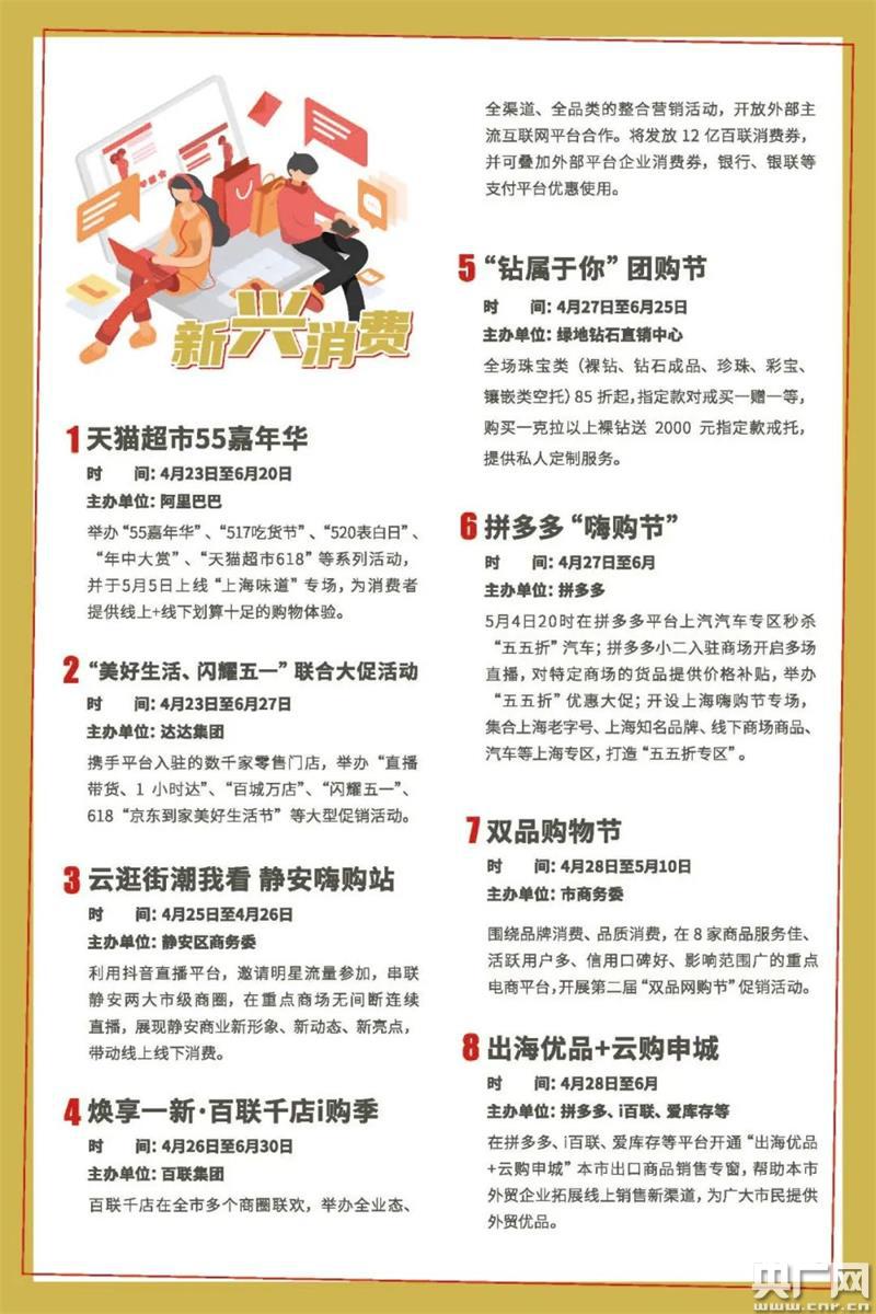 新興消費方面,將推出近30項重點活動,如阿里巴巴將打造“55聚劃算匯聚上!睂贂䦂觯_展打折、發(fā)放大額優(yōu)惠券等讓利活動,涉及1000家本地生活品牌、42萬家淘寶天貓上海商家。