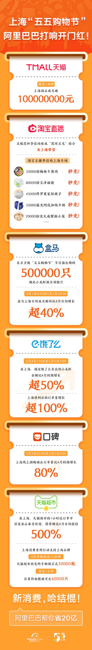 就在東方衛(wèi)視“五五購物節(jié)”節(jié)目播出期間,盒馬上架50萬只湖北小龍蝦被全部搶空,現(xiàn)在,5月5日的五五折小龍蝦正上架開售,在盒馬嗦蝦嘗鮮的人群摩肩接踵。到家到店服務(wù)節(jié)節(jié)攀升;5月4日晚19點(diǎn)到5月5日零點(diǎn),通過餓了么賣出的小龍蝦金額比4月同期勁增超50%,便利店的訂單量更是增長超100%;晚餐時(shí)間,高品質(zhì)的“米其林外賣”走俏,有消費(fèi)者一單即點(diǎn)了1139元。5月4日8點(diǎn)至24點(diǎn)間,口碑線上團(tuán)購商品的訂單量比4月同期增長了80%。