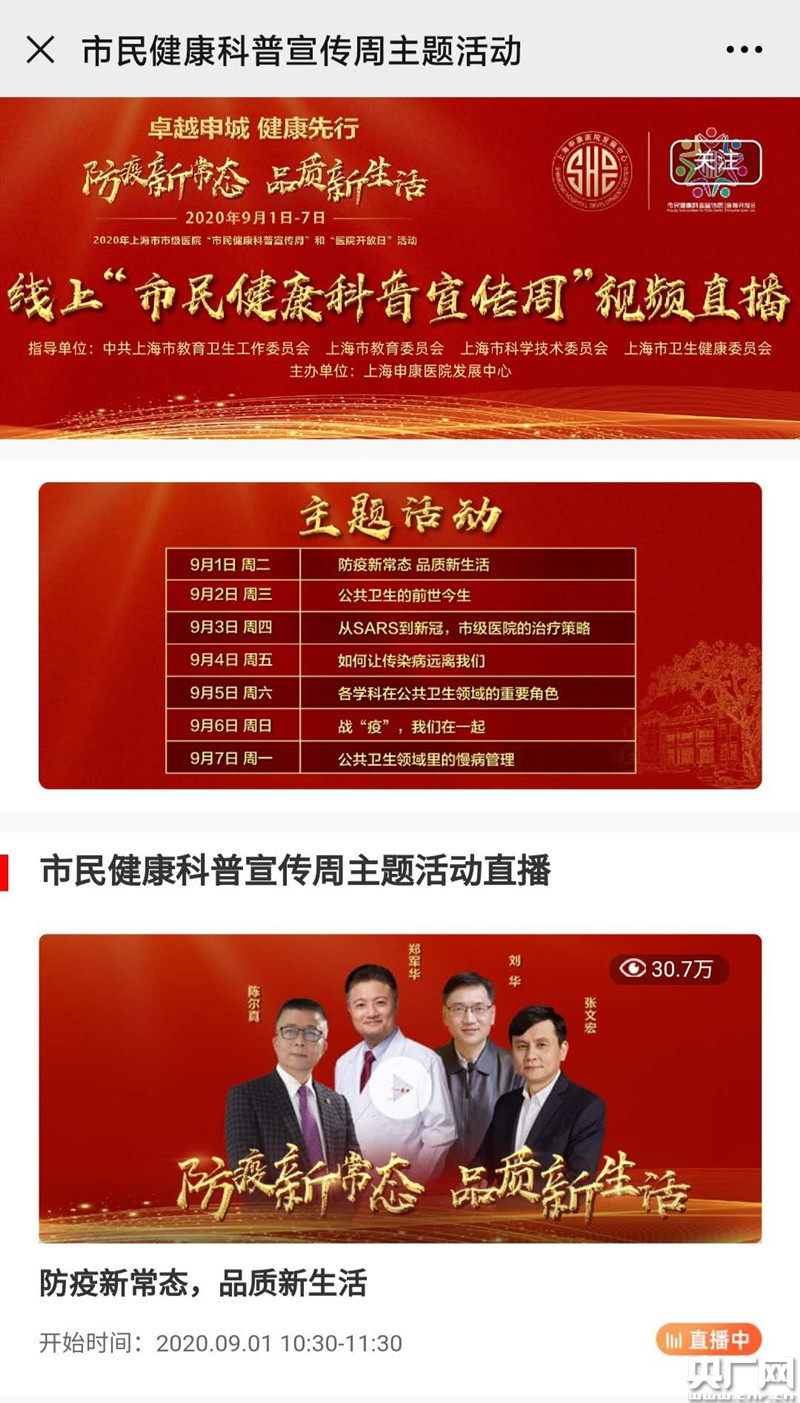 9月2日至7日期間,每日推送一個(gè)科普話題,以直播形式進(jìn)行科普宣傳,申康中心官網(wǎng)同步發(fā)布。通過(guò)圖文推送、視頻分享、在線直播等多種形式,匯集形成一份系統(tǒng)化、規(guī);摹笆忻窠】抵R(shí)菜單”,借助新媒體形式進(jìn)行線上展播,不斷推進(jìn)上海市級(jí)醫(yī)院智慧科普、精準(zhǔn)科普。